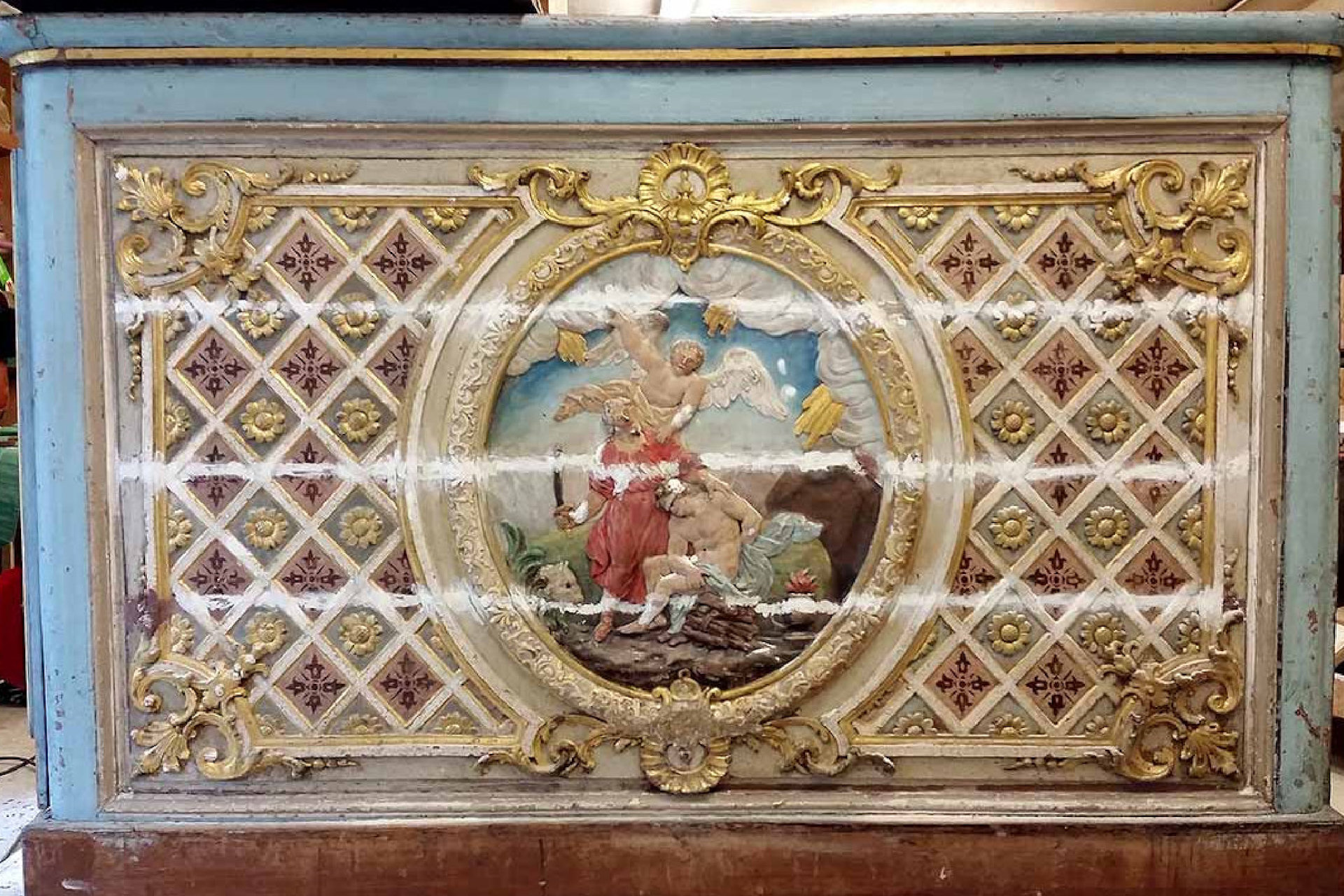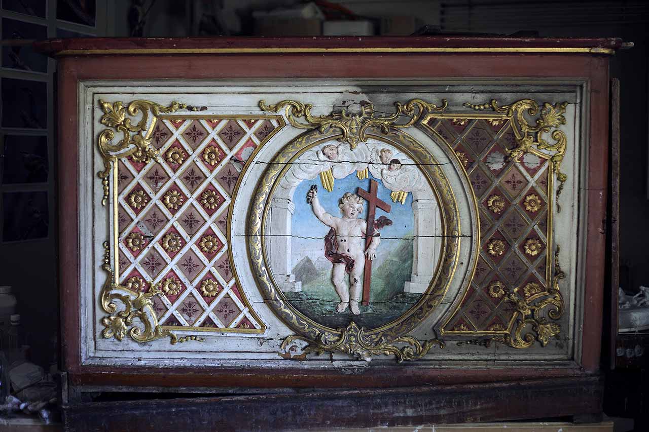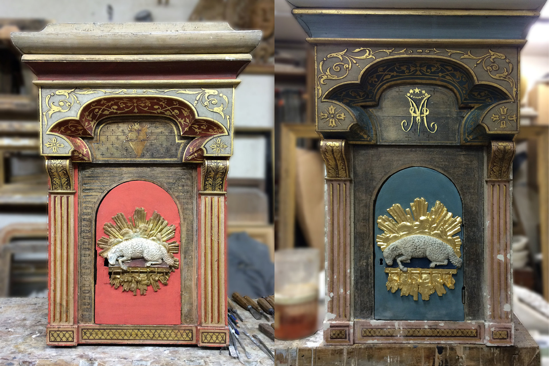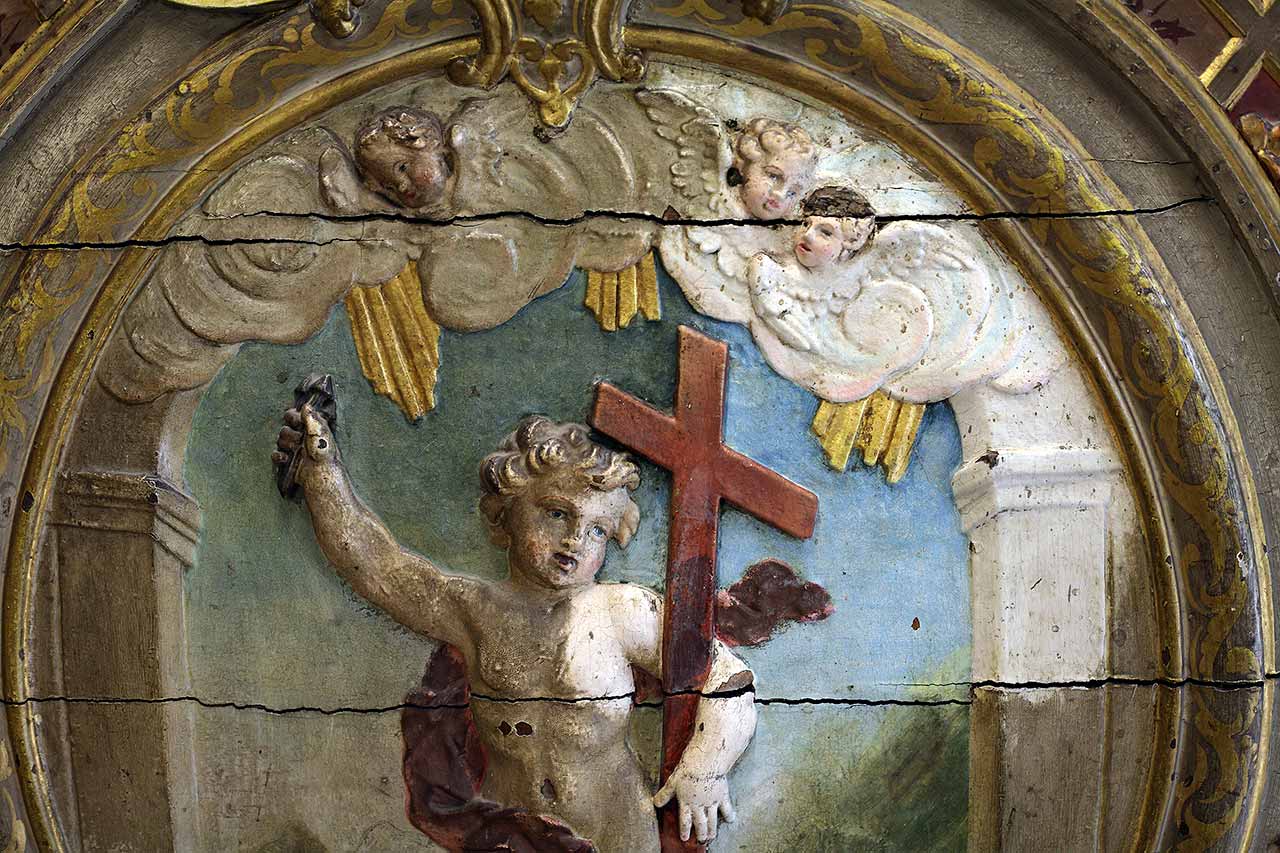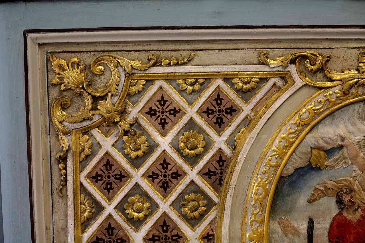 Deux autels latéraux en bois et pâte sculptés dorés et polychrome. Les deux autels forment une paire, de couleurs différentes, à partir de deux médaillons en chêne sculpté polychromé du 17e ou début 18e. Le panneau rectangulaire du “Jugement de Salomon” est entièrement de cette époque y compris les ornements sculptés (autel bleu) alors que le panneau correspondant de son pendant (autel bordeaux), n’a que le médaillon sculpté de cette époque qui représente l’enfant Jésus à la croix.