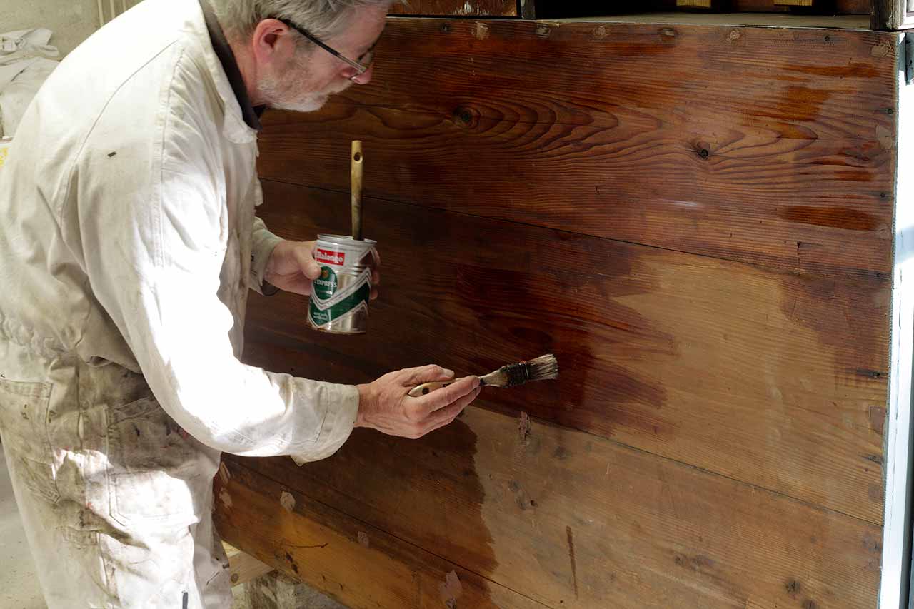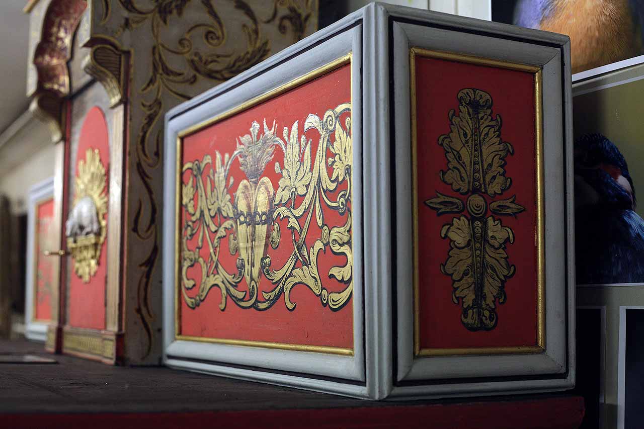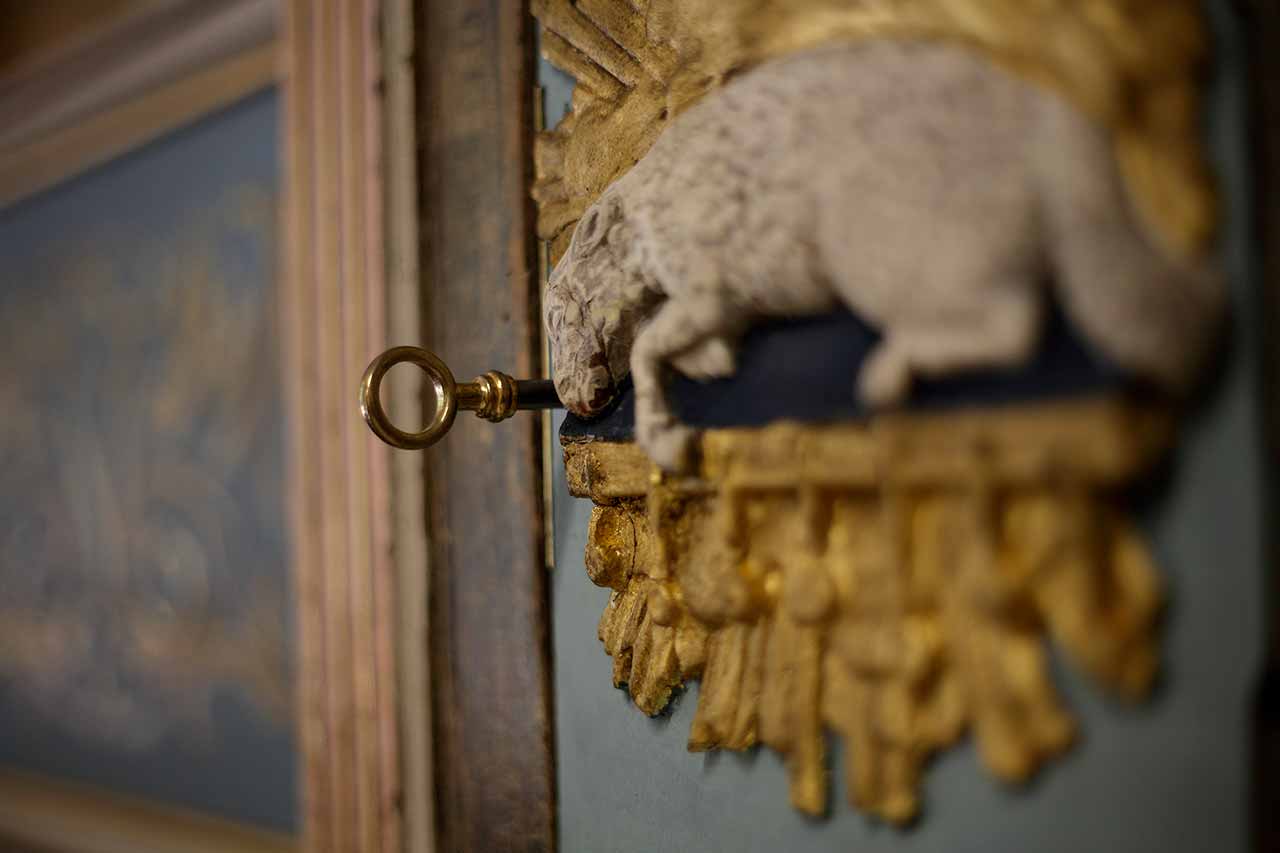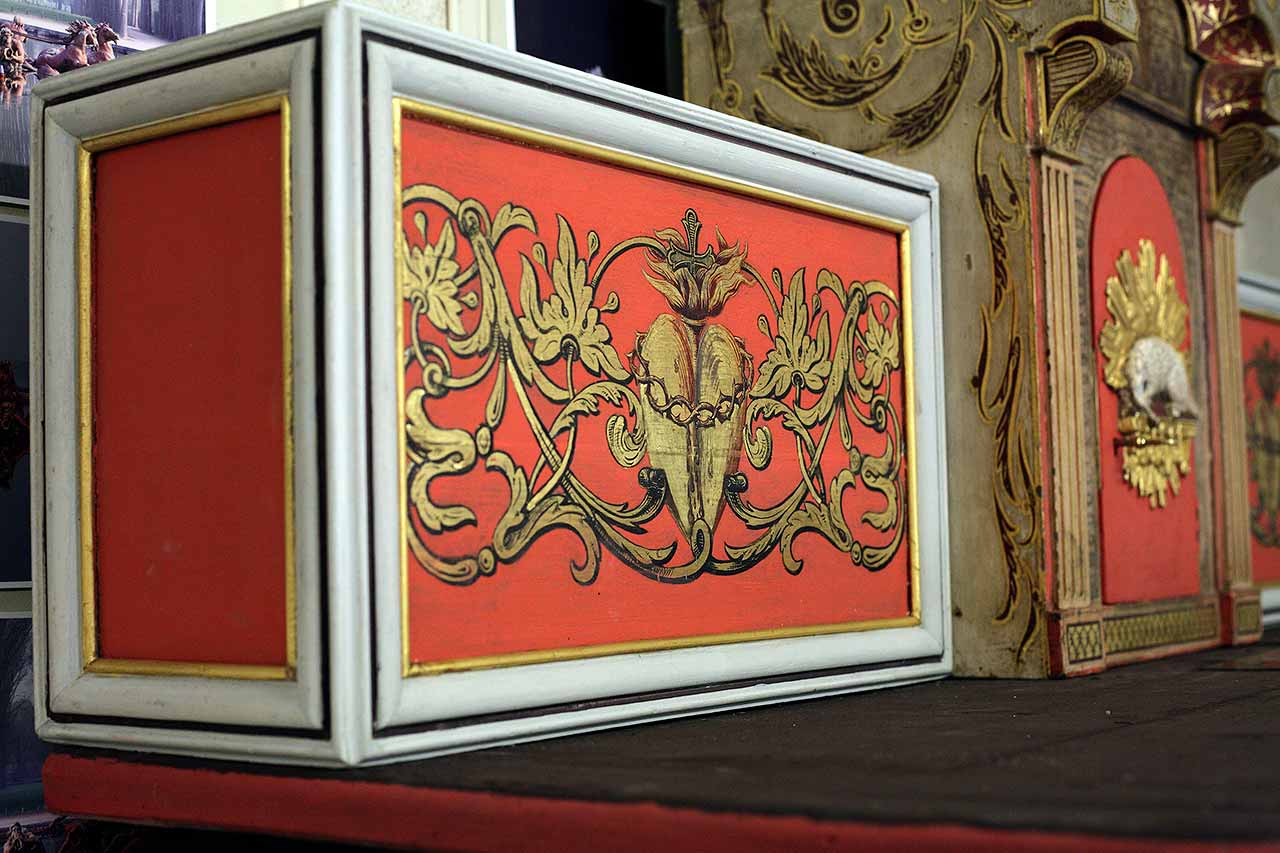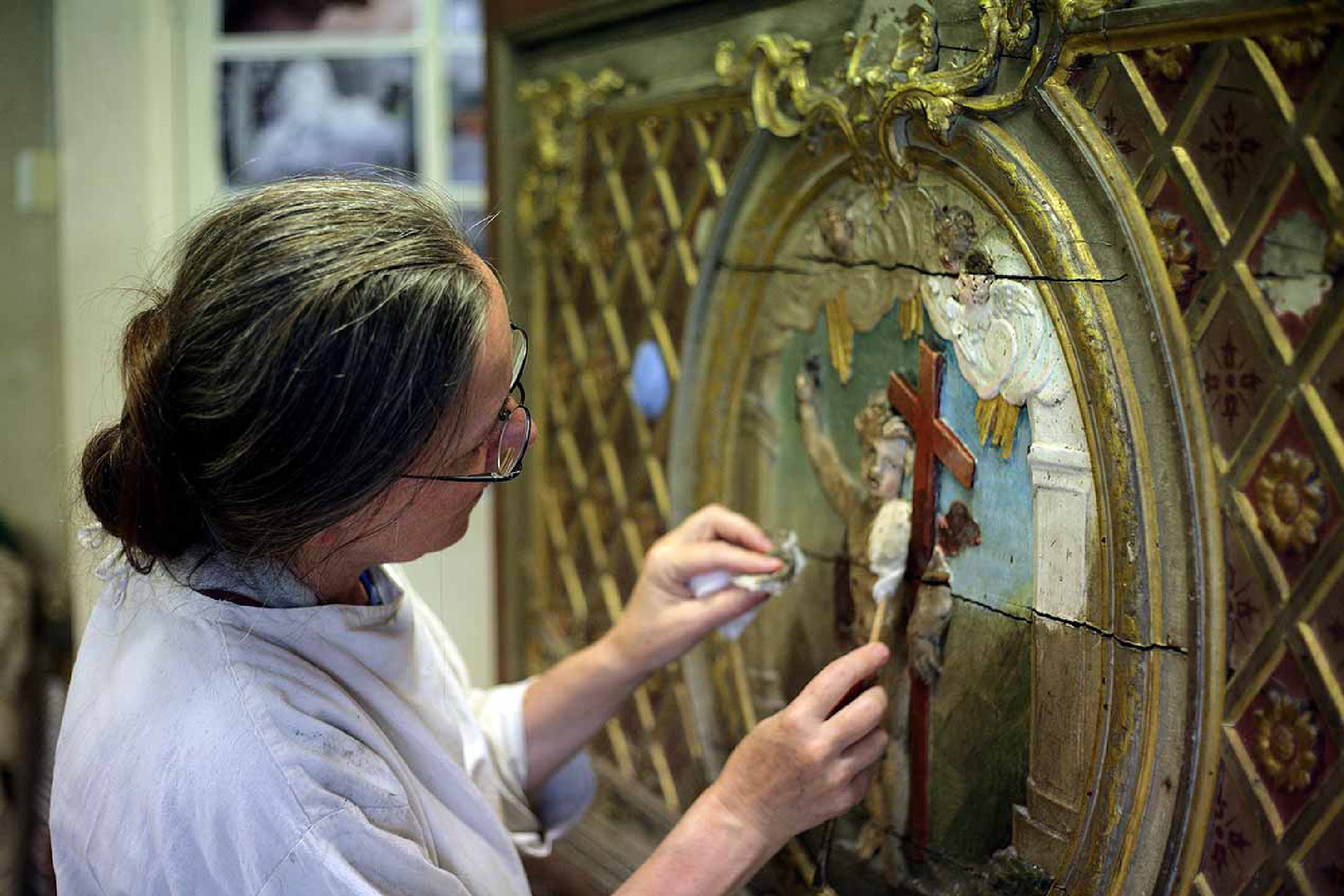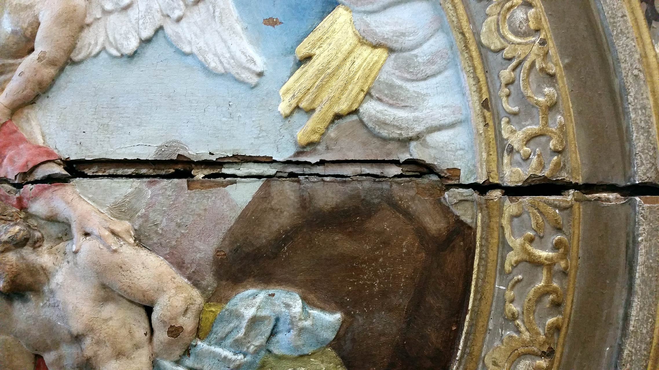 Deux autels latéraux en bois et pâte sculptés dorés et polychrome. Les deux autels forment une paire, de couleurs différentes, à partir de deux médaillons en chêne sculpté polychromé du 17e ou début 18e. Le panneau rectangulaire du “Jugement de Salomon” est entièrement de cette époque y compris les ornements sculptés (autel bleu) alors que le panneau correspondant de son pendant (autel bordeaux), n’a que le médaillon sculpté de cette époque qui représente l’enfant Jésus à la croix.