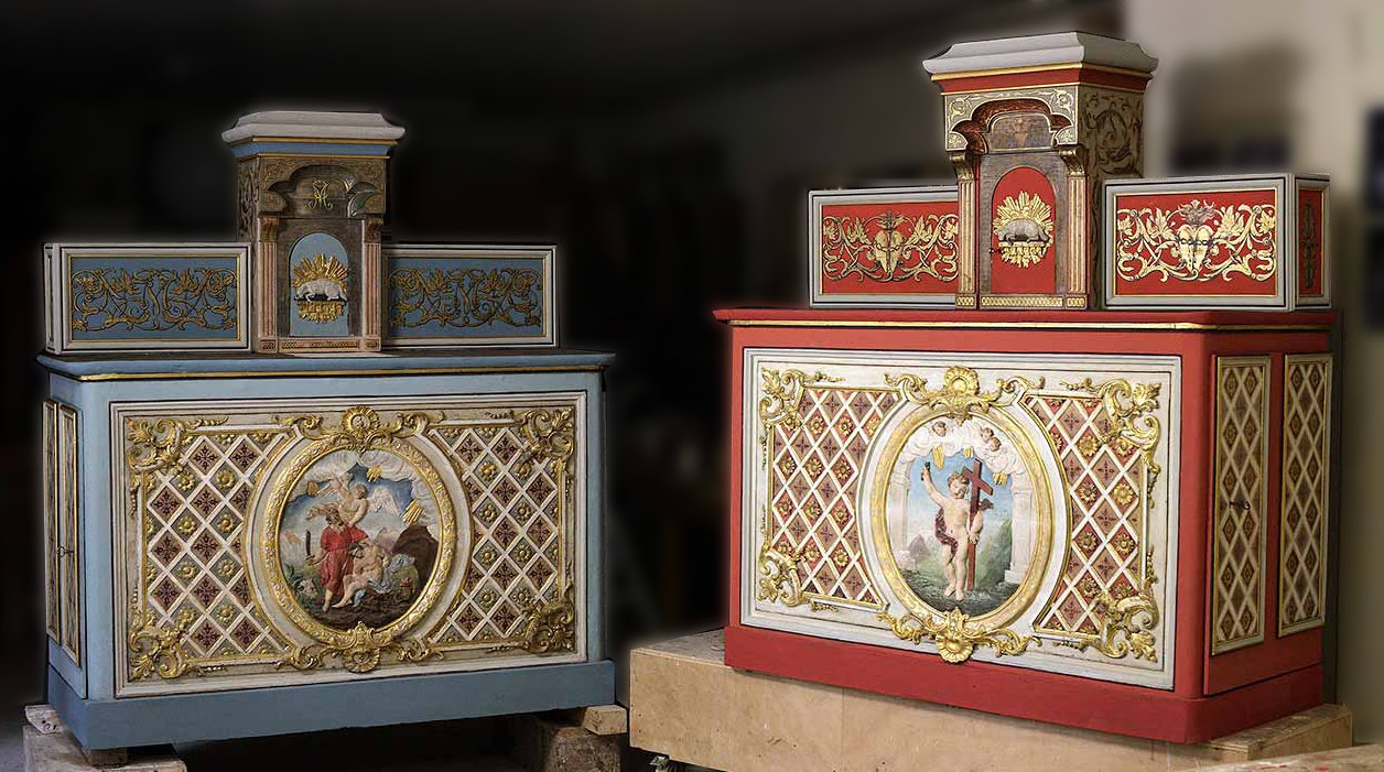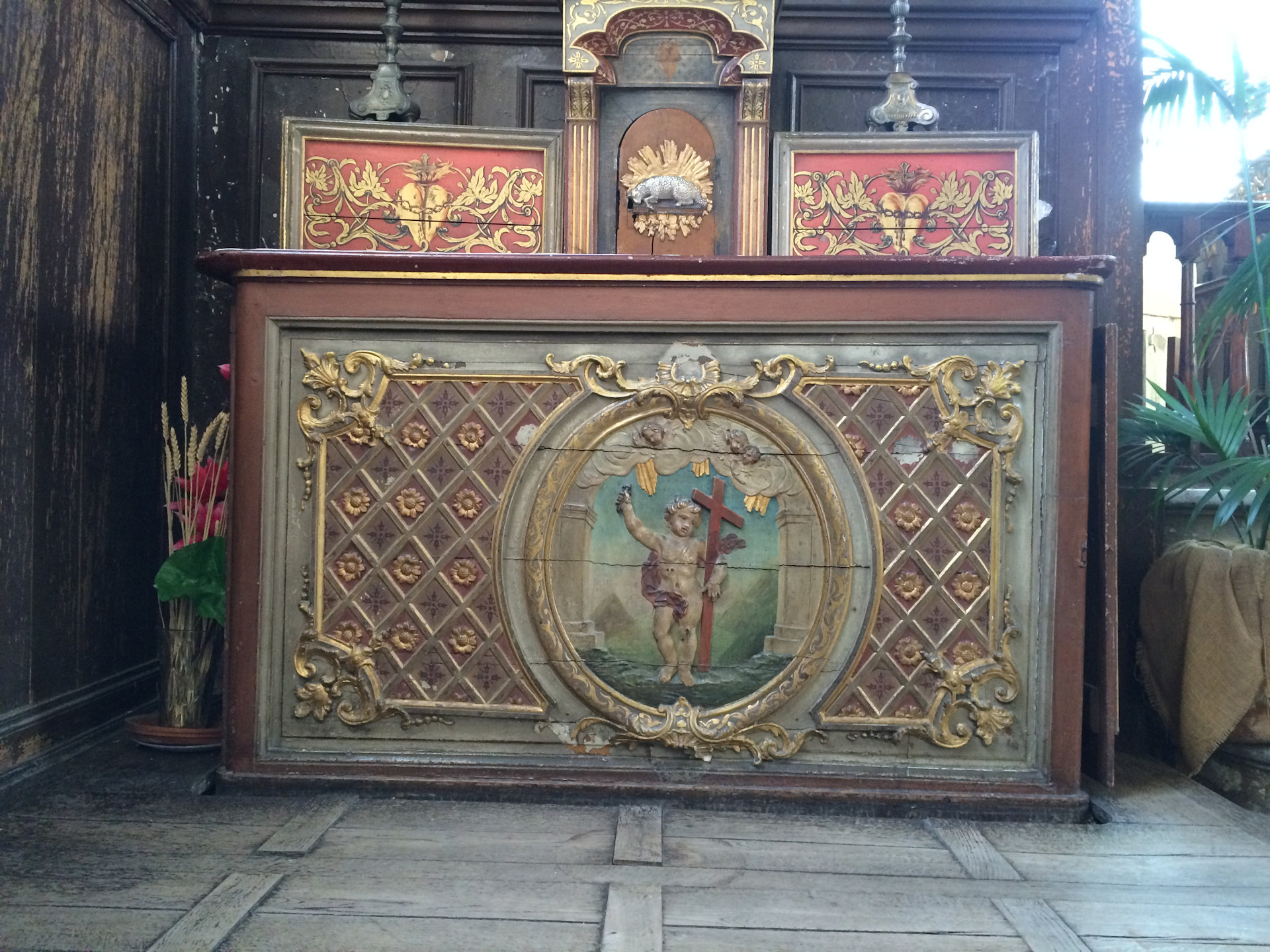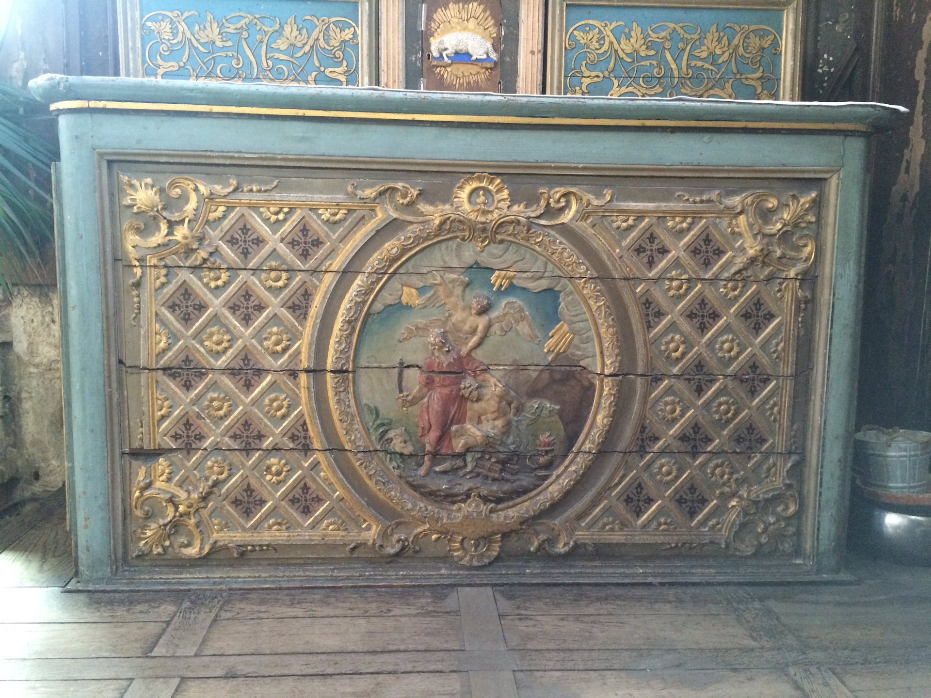 Deux autels latéraux en bois et pâte sculptés dorés et polychrome. Les deux autels forment une paire, de couleurs différentes, à partir de deux médaillons en chêne sculpté polychromé du 17e ou début 18e. Le panneau rectangulaire du “Jugement de Salomon” est entièrement de cette époque y compris les ornements sculptés (autel bleu) alors que le panneau correspondant de son pendant (autel bordeaux), n’a que le médaillon sculpté de cette époque qui représente l’enfant Jésus à la croix.